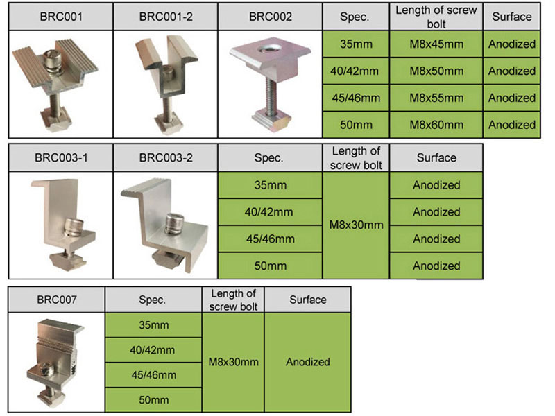 Our styles of framed mid clamp and end clamp are widely used in any kind of solar panel mounting systems.